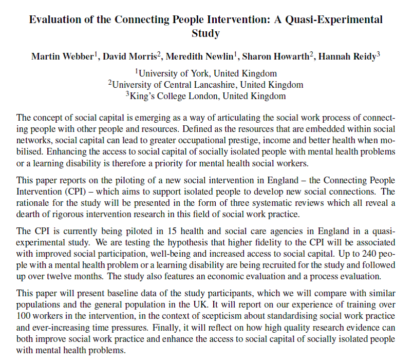 I will also be giving presentations at conferences in Finland, Los Angeles and London on the Connecting People Study during 2013, in addition to many other local workshops and seminars. If you would like me or one of the study team to talk at your event about the intervention or the study (or both), please do not hesitate to get in touch with us.
