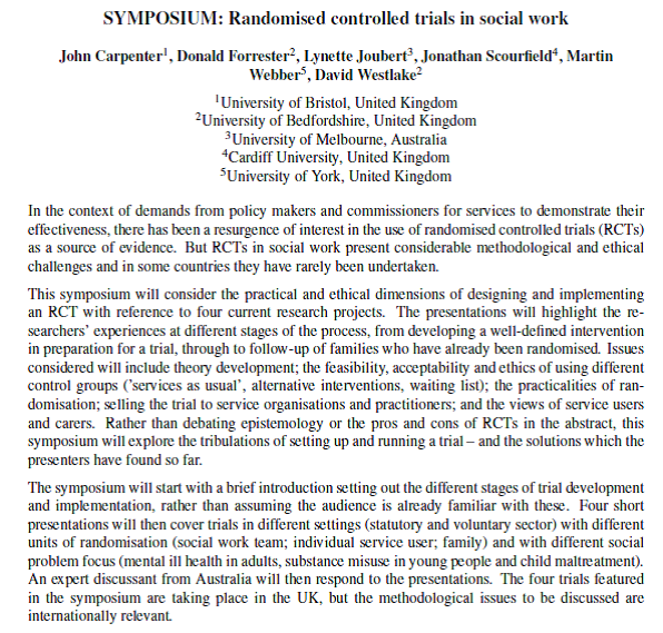 Later that day, I will be presenting a paper on the study in a Royal Holloway University of London Department of Social Work Research Seminar. This is likely to have a more academic focus than the other events as it will explore the more technical aspects of the study, including the construction of the intervention model and the methodology of the pilot study. However, limited free places are available for the seminar which will be held from 4.00pm to 6.00pm at Bedford Square in London on Friday 15th February. Please click here for more information.
